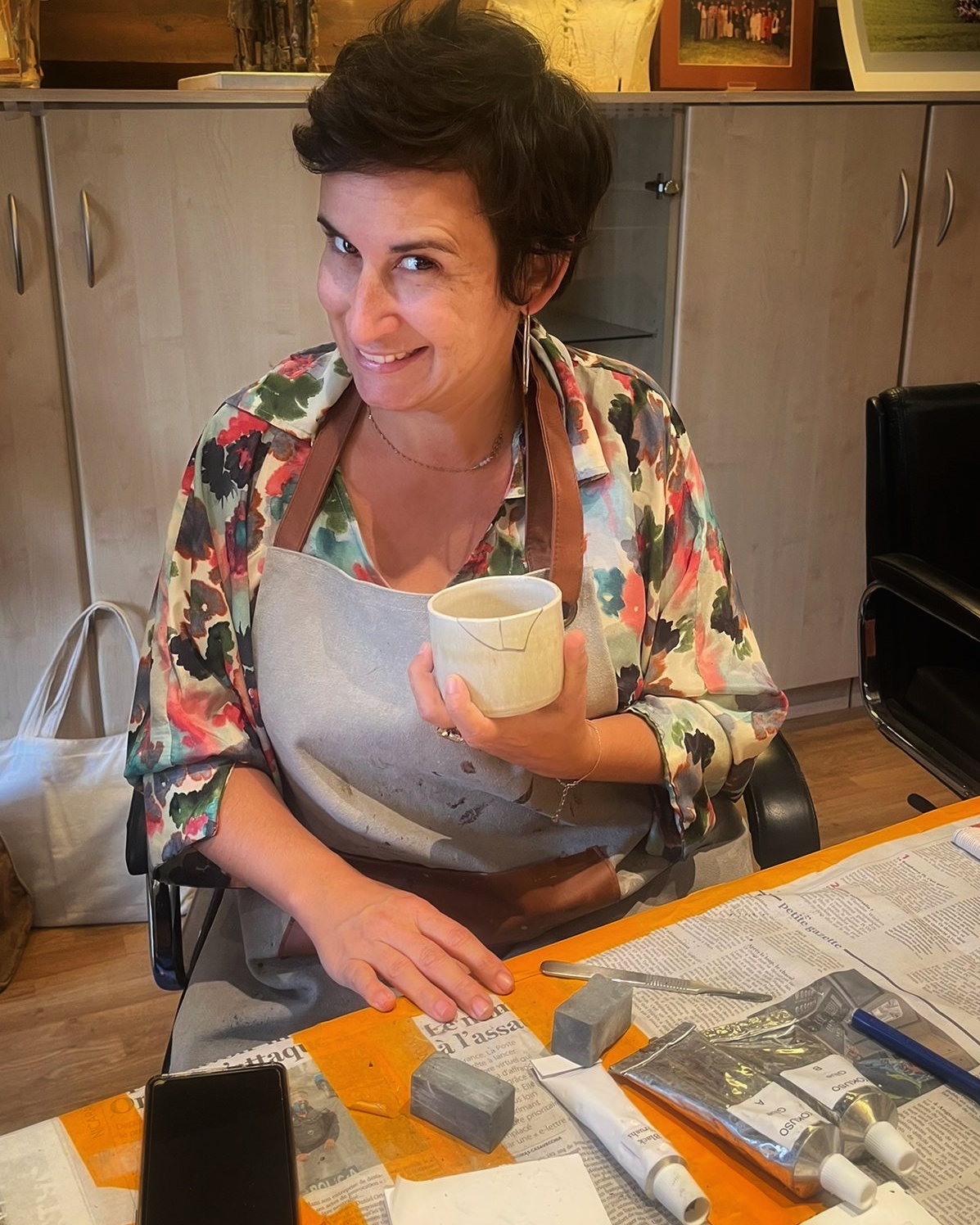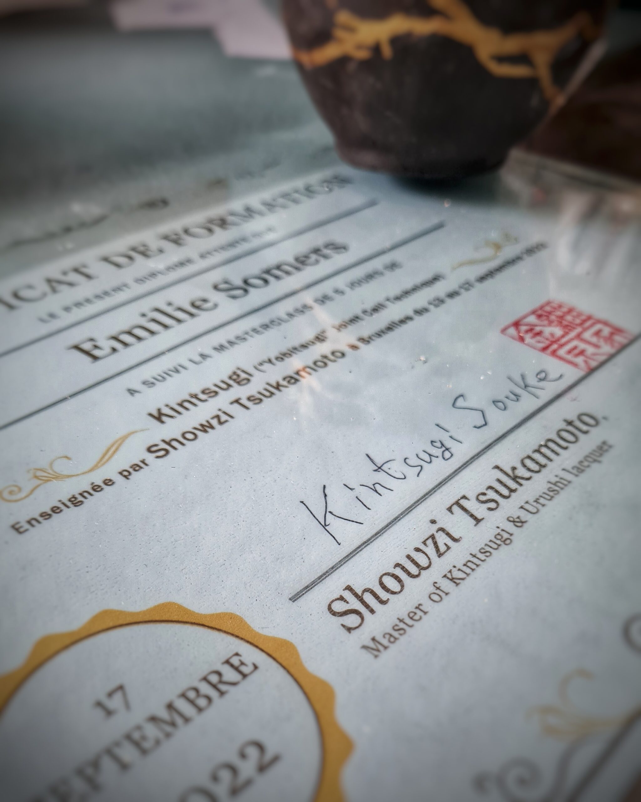 Emilie a découvert le Kintsugi en 2020 lors du confinement. Elle s’est d’abord formée chez de Jean Vinclair à Waterloo avant de parfaire sa technique auprès du Maître japonais Showzi Tsukamoto.